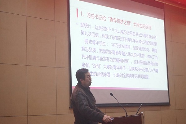 紧接着,夏永林教授向同学们剖析了回信中总书记对全体青年的四点期望,一是坚定理想信念,没有理想信念就会导致精神上“缺钙”,中国梦是全国各族人民的共同理想,也是青年一代应该牢固树立的远大理想;二是锤炼意志品质,青年大学生一定要练就过硬本领、勇于创新创造、矢志艰苦奋斗、锤炼高尚品格;三是扎根中国大地,广大青年和青年学生要接地气,响应党的号召,胸怀祖国和人民,奉献社会和他人,积极投身祖国最需要的地方;四是确立远大目标,青年大学生要志存高远,紧跟时代砥砺前行,担当责任奋发有为。