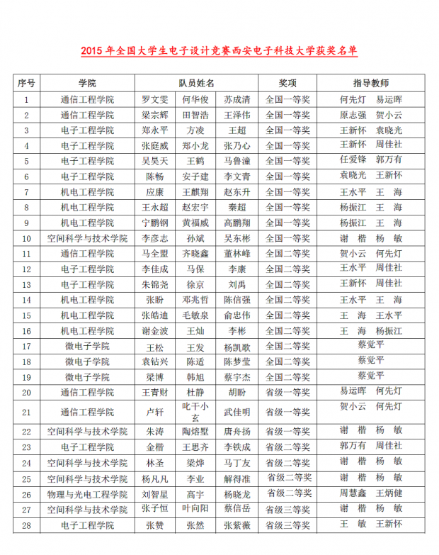 西电新闻网讯(通讯员 胡晓娟)2015年第十二届全国大学生电子设计竞赛各大奖项日前揭晓,我校37支参赛队中,10支喜获国家一等奖,较上届增长42.8%;9支喜获国家二等奖,较上届增长200%,国家奖总获奖数较上届增长90%,位列全国第一,为历年最好成绩!