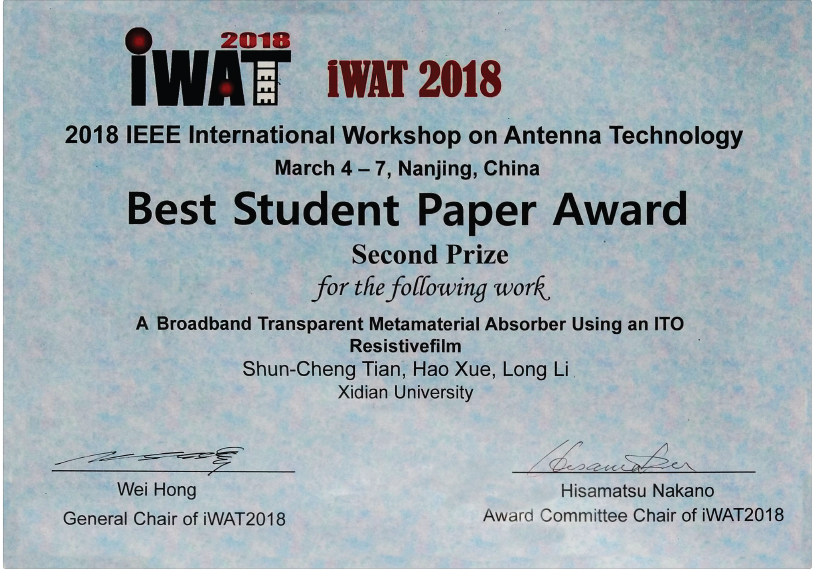 为鼓励高校学生不断学习、创新,取得更多的科研成果,本次大会还进行了“最佳学生论文竞赛”。从会议收录的论文中,经大会技术委员会(TPC)专家的严格筛选与评审,确定21篇学生论文竞赛候选资格。此21篇论文的作者在最佳学生论文竞赛答辩中展示了自己论文的成果,并回答了现场评委的相关问题,通过层层比拼,最后有六篇文章依靠论文质量与展示内容的总成绩,获得“最佳学生论文奖”。其中,西电研究生田顺成和薛皓的文章“A Broadband Transparent Metamaterial Absorber Using an ITO Resistive-film”经过逐轮角逐,最终获得“最佳学生论文奖二等奖”。