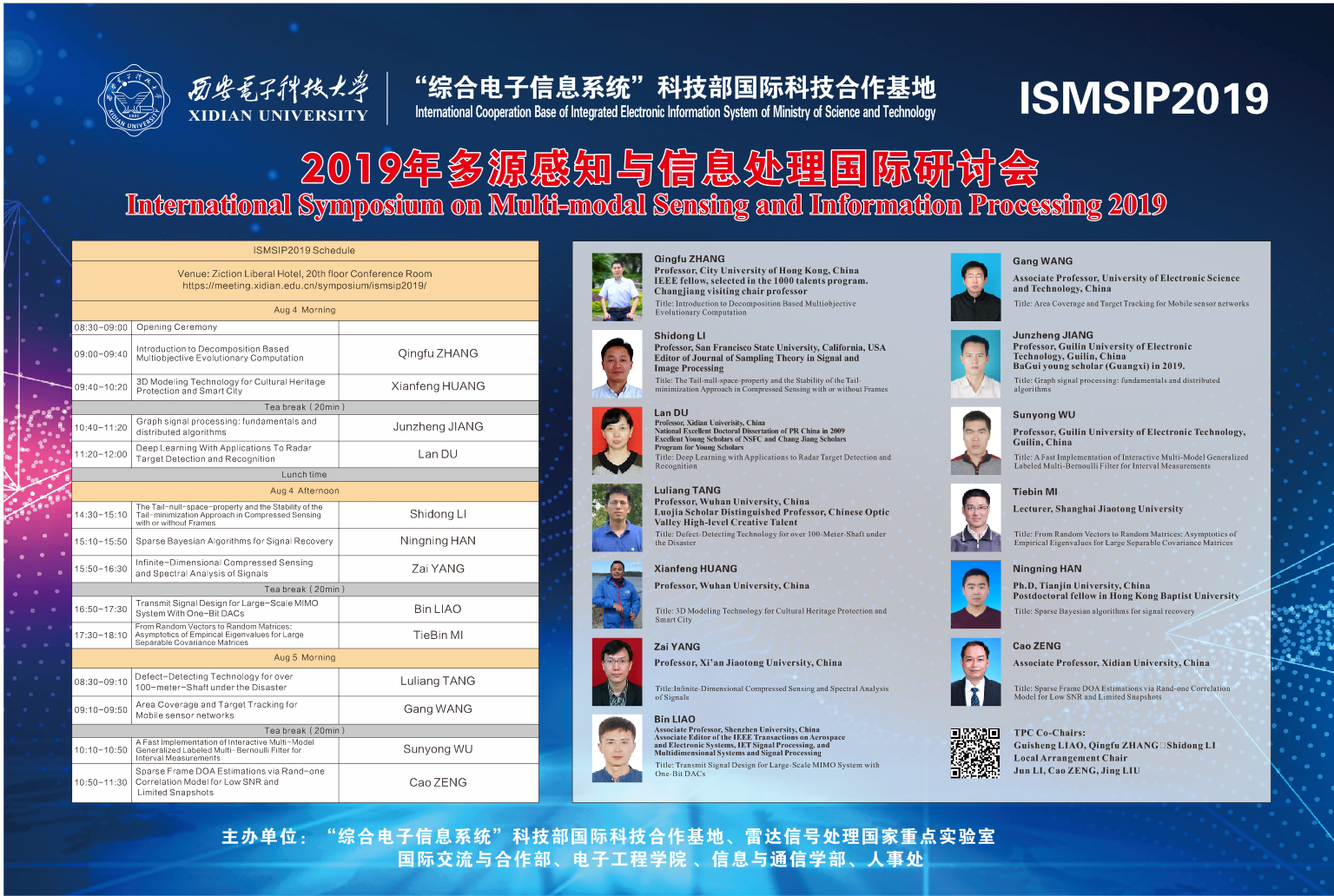 “综合电子信息系统”科技部国际科技合作基地首届国际学术研讨会(International Symposium on Multi-modal Sensing and Information Processing, ISMSIP 2019)定于8月4 - 5日在西安志诚丽柏酒店20楼会议室举行。大会邀请到来自美国和英国著名高校的IEEE Fellow等多位相关领域知名专家学者做特邀报告。