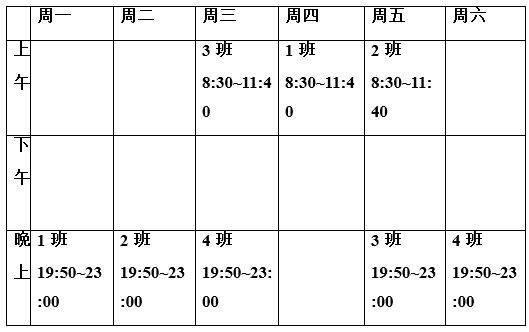 每个班每周上2次课,每次课4课时,总共4周半,时间安排如下表。首次课为理论和介绍课,只上2课时。