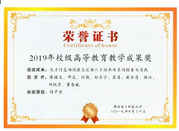 (通讯员:毛浩超)10月30日我校公布2019年校级高等教育教学成果奖评审结果,我院廖桂生教授申报的《电子信息领域拔尖创新人才培养体系的探索与实践》项目获得特等奖,周佳社教授申报的《新时代示范中心内涵建设与实践》获得一等奖。此次评选共收到申报项目39项,经专家评审,共评出特等奖6项,一等奖9项,二等奖11项。