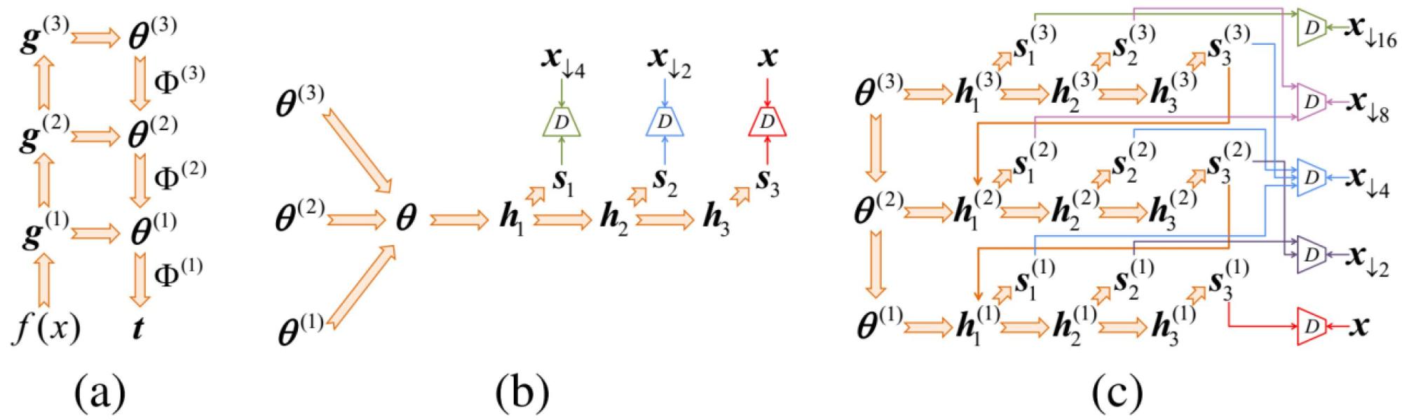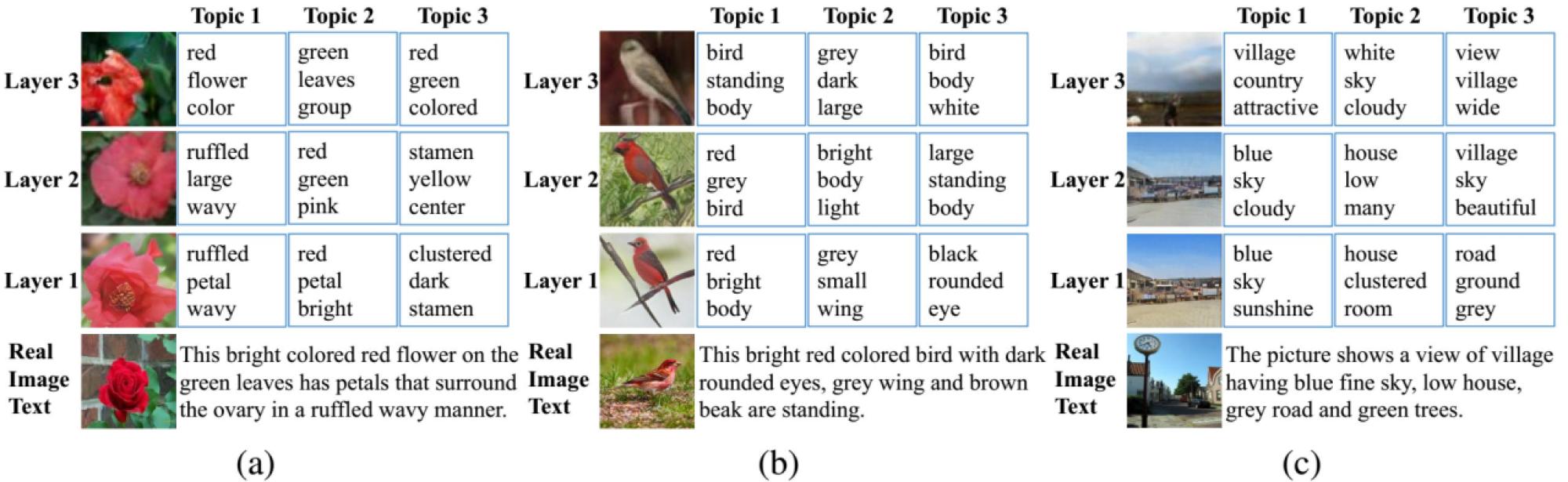 针对这些问题,本次发表的研究基于团队在深度概率统计模型方面的系列工作,提出了一种全新的深度层次化概率多模态模型,用于同时建模文本和图像数据。该论文利用生成对抗网络建模图像,利用深度概率模型建模文本,并在不同层之间建立了关系,从而实现了图像文本模态之间的双向转换。具体而言,团队首先提出了变分异构多层自编码网络。如图1(a)所示,由图像作为输入,编码推理双模态共享的多层概率隐变量,进而通过概率解码主题模型生成文本。这样可以实现图像到文本的转换。反过来给定文本的情况下,可以利用吉布斯采样推理不同层的概率隐变量,进而通过图1(b)的stackGAN模型,生成图像,实现文本到图像的转换。为了更好地建模两个模态之间的层次化关系,团队又提出了如图1(c)所示的raster-scan-GAN模型,进而实现了图像从语义粗糙到语义精细的生成过程,如图2所示。实验结果表明,模型不仅仅在多个文本图像联合学习任务中取得优异的性能,同时可以挖掘两个模态在不同层之间存在的关系,这为后续的分析和数据处理提供了可解释的依据。