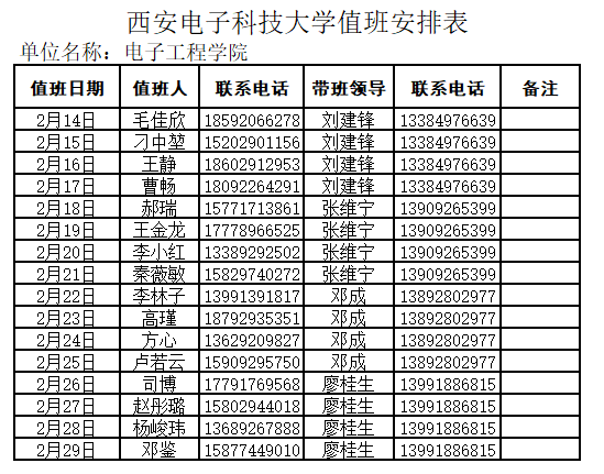 成立以廖桂生院长为组长的 “疫情防控”领导组,下设五个具体工作组,分别是学生管理工作组、本科生教学工作组、研究生教学工作组、科研建设工作组及教职工管理工作组。各组明确分工,相互配合,并行处理防控相关及日常业务工作,所需物资与后勤保障由办公室主任为联络员,统一调度。具体分工如下: