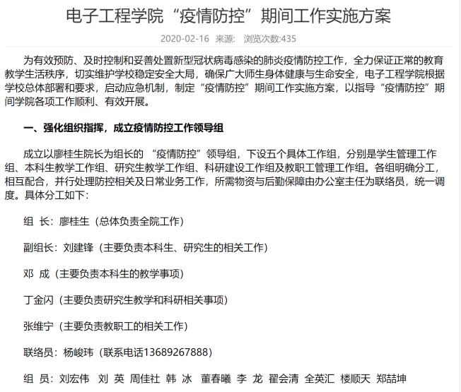 按照“停课不停学”“停课不停教”的思路,分别成立学生管理工作组、本科生教学工作组、研究生教学工作组、科研建设工作组及教职工管理工作组,明确责任分工,相互协调配合,确保迟延开学期间各项工作正常开展。