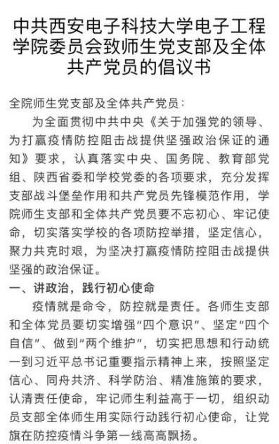 《中共威尼斯9499登录入口委员会致师生党支部及全体共产党员的倡议书》通过网站和微信公众号向全院师生及时发布,设置了疫情期党建先锋岗和责任区,积极动员全体师生党员充分认识疫情防控工作面临的严峻形势,旗帜鲜明讲政治,全力以赴积极有序地做好疫情防控工作。