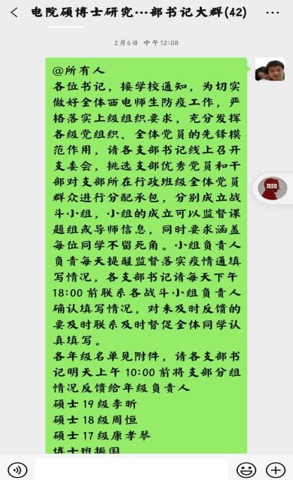 通过制定“全体党员开展疫情防控专题培训的通知”,组织各支部成立防疫工作小组,召开线上支部会议,强化阵地意识,践行党员初心使命带头落实防控举措,充分发挥支部战斗堡垒作用,确保广大师生的生命安全。人员在隔离,爱心在传递。截止2月18日,学院陈渤等党员同志共上缴特殊党费12500元。