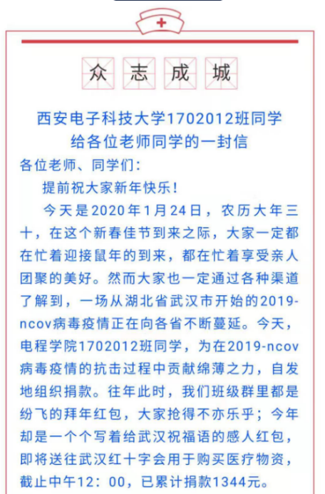 2020年1月23日,农历新年来临之际,威尼斯1702012班同学,在看到电视上全国新型冠状病毒感染的肺炎防疫物资紧缺的报道后,自发组织捐款。大年三十短短一上午时间,班委就募集了来自80名同学共计1644.34元的捐款。“隔离病毒但不能隔离爱!”1702012班还通过微信公众号等平台全校同学发出号召:让我们一起行动起来,为患者祝福,为所有奋战在疫情一线的医护人员、科研人员祝福,贡献自己的爱心,发扬中华民族“一方有难,八方支援”的精神,共同对抗疫情!