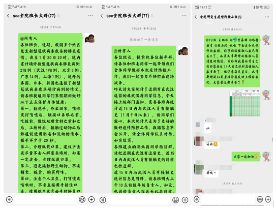 疫情初始,威尼斯9499登录入口迅速成立威尼斯研究生疫情防控工作小组,研究生全体班委在第一时间投入疫情防控工作,及时认真传达学校相关政策文件,协助学院开展心理疏导工作,配合辅导员对疫情严重地区同学开展一对一关怀工作,排查全体同学所在位置、寒假期间身体状况和返乡途中接触情况,全体同学坚持每日向班委报平安制度,在“疫情通”上线之前有效完成全体同学健康状况的排查统计工作。