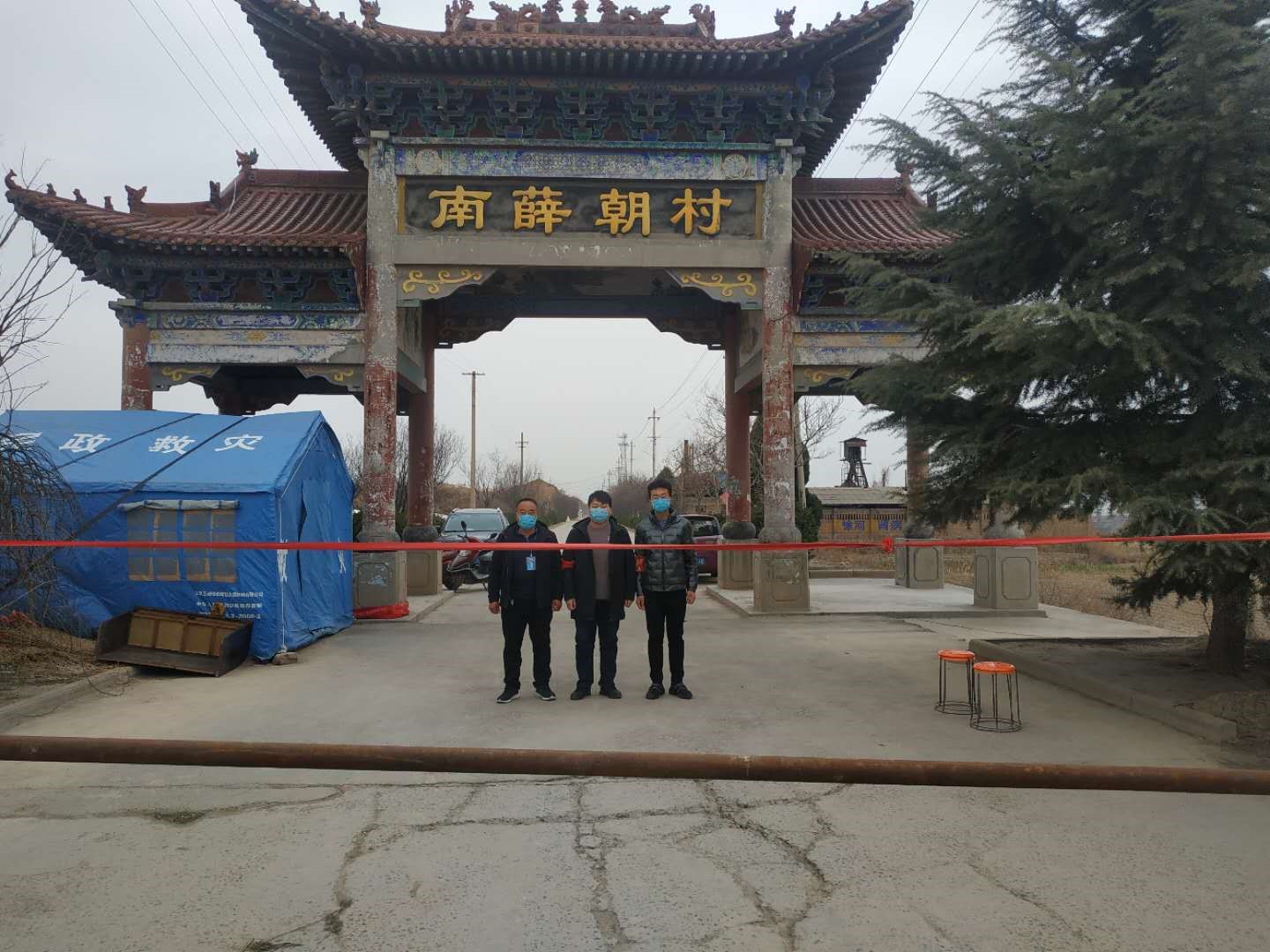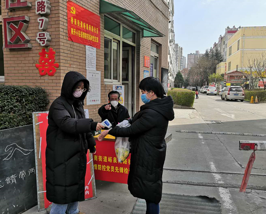 南映红同学在村党员先锋队值班,负责测体温,登记出入信息