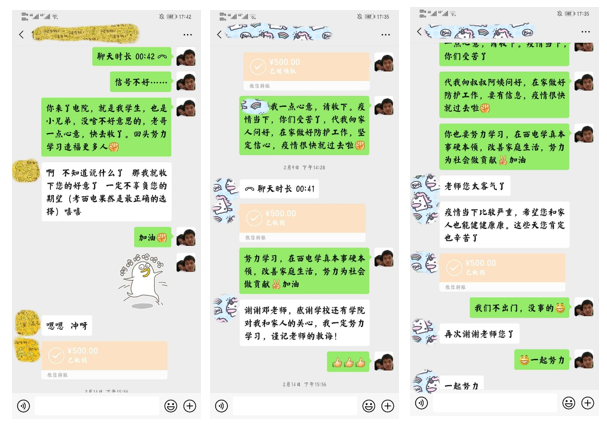 疫情爆发后,威尼斯9499登录入口研究生辅导员积极开展帮扶工作,对湖北籍建档立卡、家庭经济困难的学生保持密切沟通。辅导员对受疫情影响较大的三位家庭困难同学各送去500元慰问金,并积极帮助同学申报学校研究生特殊困难补助,在学校和学院的暖心政策下,同学们更加坚定战胜疫情信心和决心。