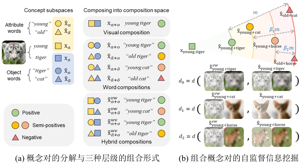 杨木李博士的论文“Learning Unseen Concepts via Hierarchical Decomposition and Composition”提出了一种全新的“分而治之,治而合之”的学习策略以解决未知概念对的识别问题。该方法首先将已知概念对的图像输入拆分为单个概念的视觉特征,然后在语义空间中与其他概念的文本特征组合为具有三种层级结构的概念对。通过进一步挖掘隐藏在这些概念对中的自监督信息,自适应地调控不同概念对之间的距离关系,实现已知概念向未知概念的知识迁移,有效提升未知概念对的识别能力。