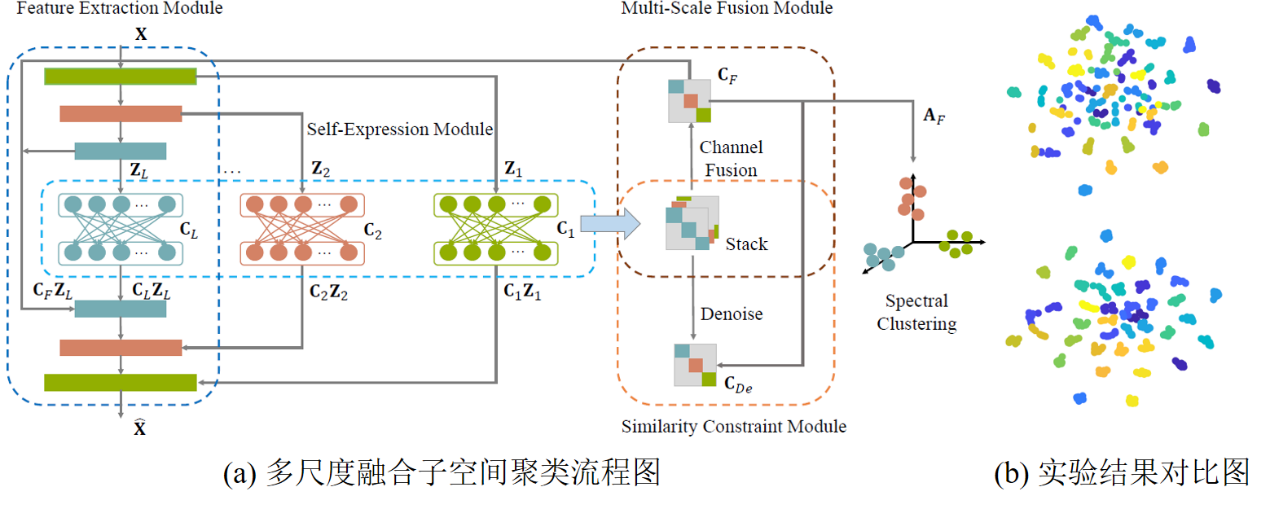 党致远博士的论文“Multi-Scale Fusion Subspace Clustering Using Similarity Constraint”设计了一种使用相似性约束的多尺度融合网络来学习更具判别力的自表示系数矩阵。该方法首次提出融合深度子空间聚类中的多尺度信息,大幅提高了深度子空间聚类在多个基准数据集上的性能。