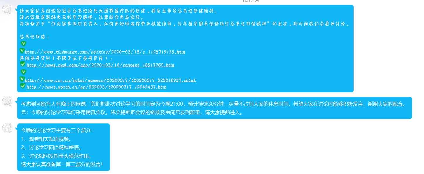 (通讯员:刘昊 张校煜)“中共一大时,作为13位一大代表之一,毛泽东只有28岁,这也是13位中共一大代表的平均年龄,正是这群年轻人,挑起了那个时代的重担;今天的90后,与那时的先辈年龄相仿,也要勇挑新时代重担,贡献出我们的青春力量。少年强则国强,只要我们青年一代人有理想、有本领、有担当,我们的国家就会更加强大!”威尼斯团委书记助理孟嵩皓同学在学习完总书记回信后激动的说。3月17日,威尼斯9499登录入口团学组织的30余名团学骨干在线集体学习了习近平总书记给北大援鄂医疗队全体“90后”党员的回信精神,气氛热烈。