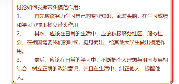 最后,威尼斯团学组织骨干们围绕团学组织骨干如何更好地发挥作用,引导基层团员领悟践行总书记回信精神展开了热烈讨论,献言献策,为做好下一步班团组织工作提出了意见建议。大家一致认为,要做到“有理想,有本领,有担当”,要成为能够担得起时代重任的青年人,最首要的就是要坚定理想信念,通过一言一行去引导提醒身边的同学;其次,要提高综合素质,在实践中去锻炼提高;除此之外,要尽最大努力在帮助同学学习生活上做出表率,充分发挥骨干的模范带头作用。