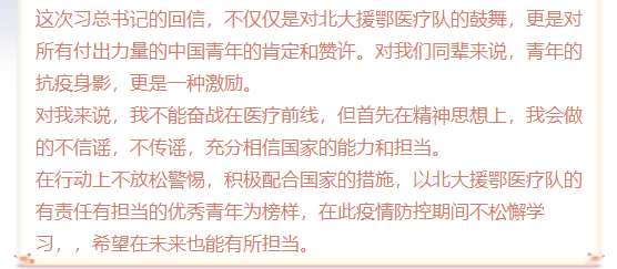 威尼斯团委信息部负责人史庭磊说到:“在这次疫情中,涌现出了无数的英雄,他们逆流而上,冲锋在疫情的第一线,他们与疫情赛跑,与病魔较量,为无数的人们带去健康,在这其中,九零后展示出了他们自己的力量,为我们展示了青春一代的蓬勃生机,同时我们要学习他们的精神,做到脚踏实地,坚定不怕苦不怕牺牲的信心,将人民群众的需求放在第一位。最重要的不是几零后,而是‘努力后’、‘奋斗后’,能够到祖国最需要的地方去,能够为国家做贡献,为人民服务,才是实现人生价值最好的途径。每个人都有自己的任务,我们也要在我们的位置上做好我们自己,为祖国和人民做出贡献,奉献我们的青春力量。”