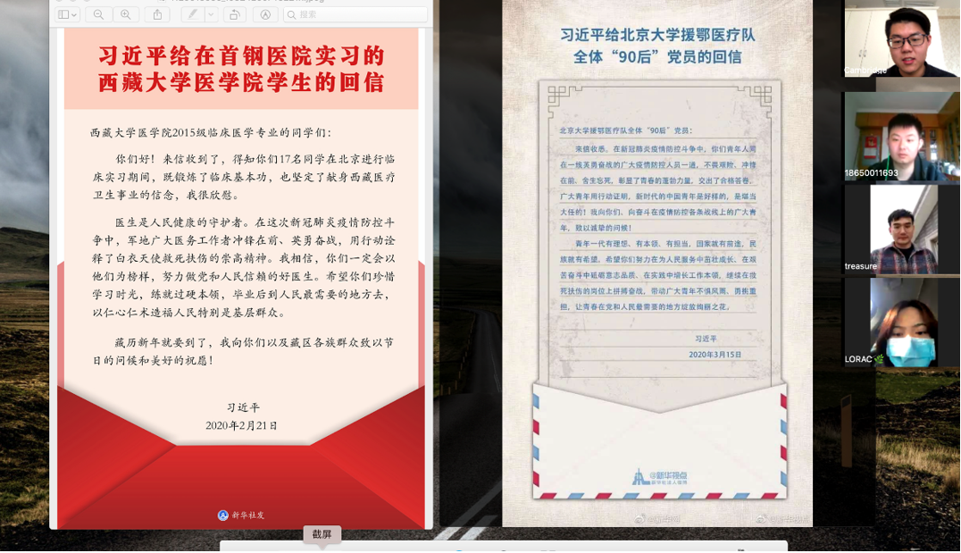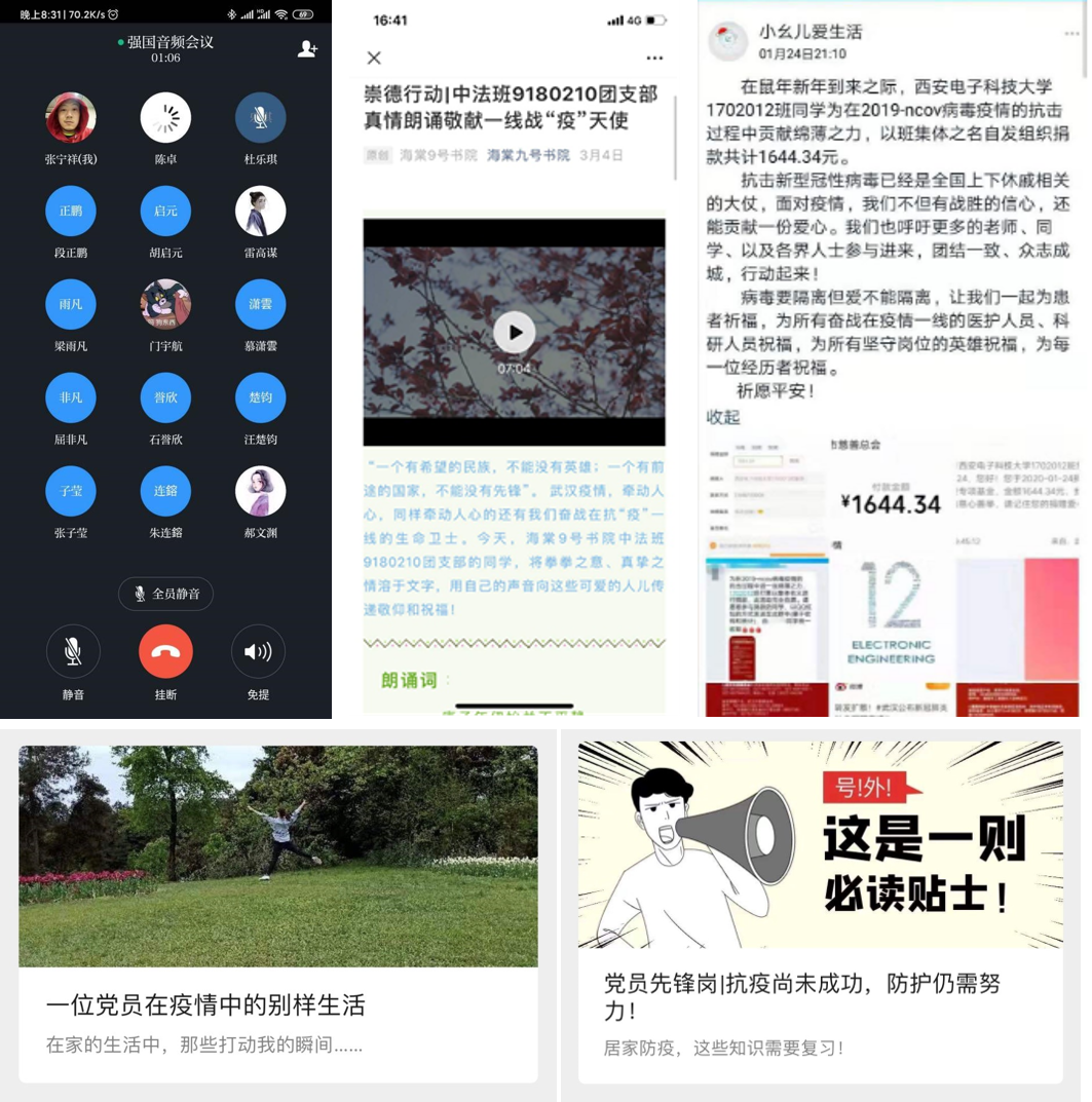 2018级向全体党员发出了《战‘疫’有我 党员先行》倡议书,倡导全体党员按时参加在线党组织生活,设立“党员先锋岗”,实施“先锋打卡”计划,引导党员同志把身份亮出来、把责任扛起来,带动同学们在疫情防控期间开展良好的学习生活,坚定战胜疫情的信心;中法班自编自演小视频——致敬一线战“疫”英雄,用声音向可爱的战“疫”英雄致敬;各年级组织学生线上学习习近平总书记给在首钢医院实习的西藏大学医学院学生的回信,以及习近平给北京大学援鄂医疗队全体“90”后党员的回信。