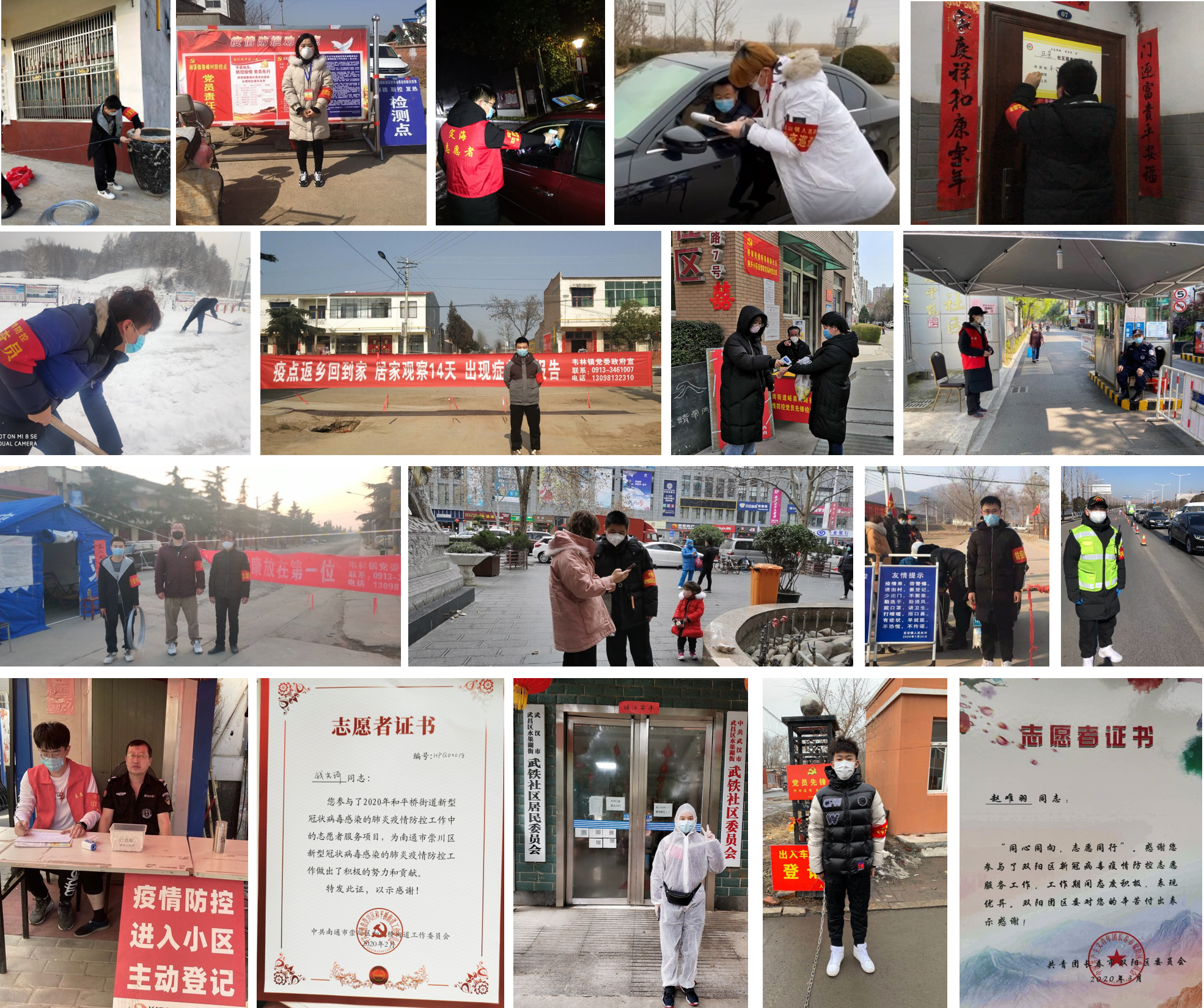 19级学生方瑜在甘肃定西社区门口为进出人员进行体温检测;18级学生李昌壕负责给通过村口的车辆进行消毒以及给进出人员测量体温等防护工作;17级王伟在郑州亚星社区开展志愿者服务活动,主要开展出入人员登记、政策讲解、标识张贴等工作;16级刘业成同学与社区工作人员24小时轮流值班,负责控制人员流动和协助买药送药工作……近百名威尼斯9499登录入口学子在不同地区、在不同岗位,认真忠诚履职尽责,敢于担当作为,争做打赢疫情防控战的先锋表率。