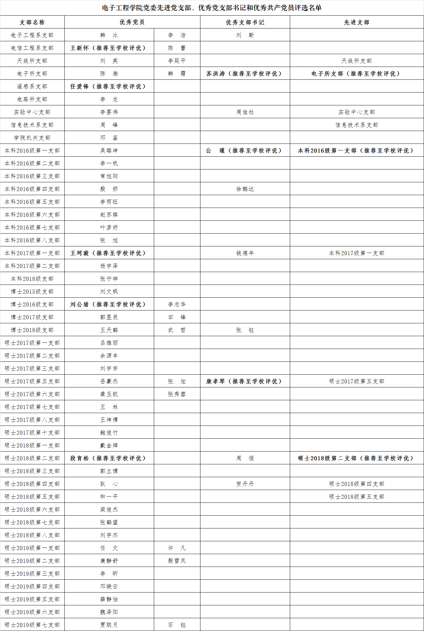 按照“自下而上”的方式, 经过各支部酝酿推荐,学院党委组织投票评选的方式,经学院党委会通过,产生学院先进支部、优秀支部书记、优秀共产党员名单和推荐至学校先进支部、优秀支部书记、优秀共产党员评优名单,现公示如下: