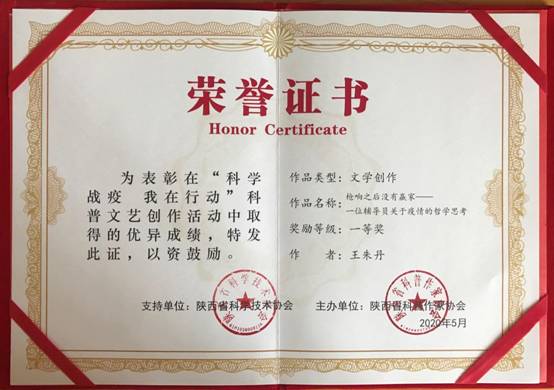 辅导员王朱丹获陕西省“科学战疫我在行动”科普作品一等奖