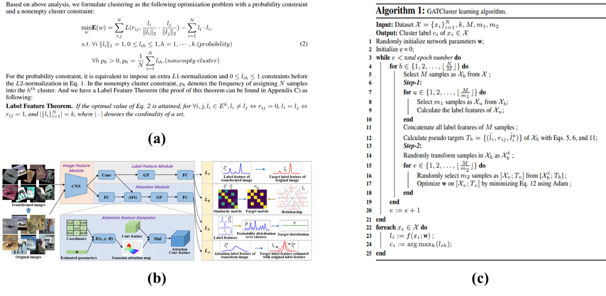 我院梁继民教授指导的博士生牛闯的研究论文《GATCluster: Self-Supervised Gaussian-Attention Network for Image Clustering》被今年ECCV录用,该研究属于无监督学习或自监督学习领域。图领奖获得者以及深度学习先驱Geoffrey Hinton和Yann Lecun曾在多次演讲中表示,目前深度学习大多数面临的问题都来自有监督学习,而无监督学习或者自监督学习是人工智能的未来(https://www.cs.cornell.edu/content/unsupervised-learning-next-frontier-ai)。无监督学习已成为当前深度学习研究的热门领域之一,其中复杂自然图像的无监督聚类或无监督分类是无监督学习领域中最具挑战的问题之一。由于没有人工标记指导模型训练,如何优化模型使其能够提取出图像的语义特征,以及如何避免聚类过程陷入简单解是无监督聚类任务在理论上面临的主要挑战;此外,无监督聚类通常需要在一大组图像数据上进行统计分析,如何处理大尺寸图像是无监督聚类任务主要面临的技术挑战。