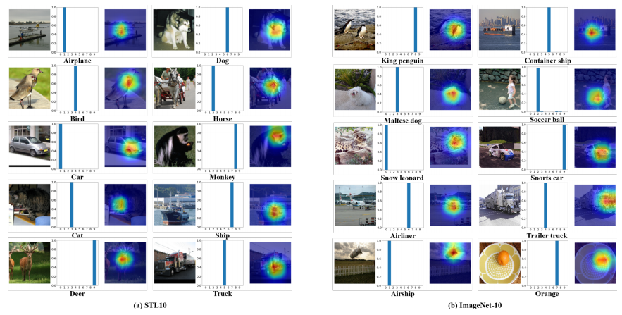 针对上述问题,本研究提出了标签特征定理,从理论上证明了如何避免简单解,并设计了无监督注意力机制来提取以局部物体为导向的语义特征,这也是第一个将注意力机制与无监督学习结合的工作;从技术上,本研究提出了针对无监督聚类任务的自监督学习算法,具有显著的内存高效性,能够处理现代数据集(如ImageNet)中的大尺寸自然图像。图1(a)~(c)分别展示了本研究提出的标签理论,整体模型结构,以及自监督学习算法。大量的实验结果表明本研究提出的方法极大提高了聚类的准确率,如在STL10数据上比现有最好方法在三个常用聚类性能指标上分别提高了8%,7%和10%。另外,本研究提出的无监督聚类方法在聚类的同时,还能给出局部语义物体的定位(如图2所示),从而使该神经网络模型具有更好的可解释性。
