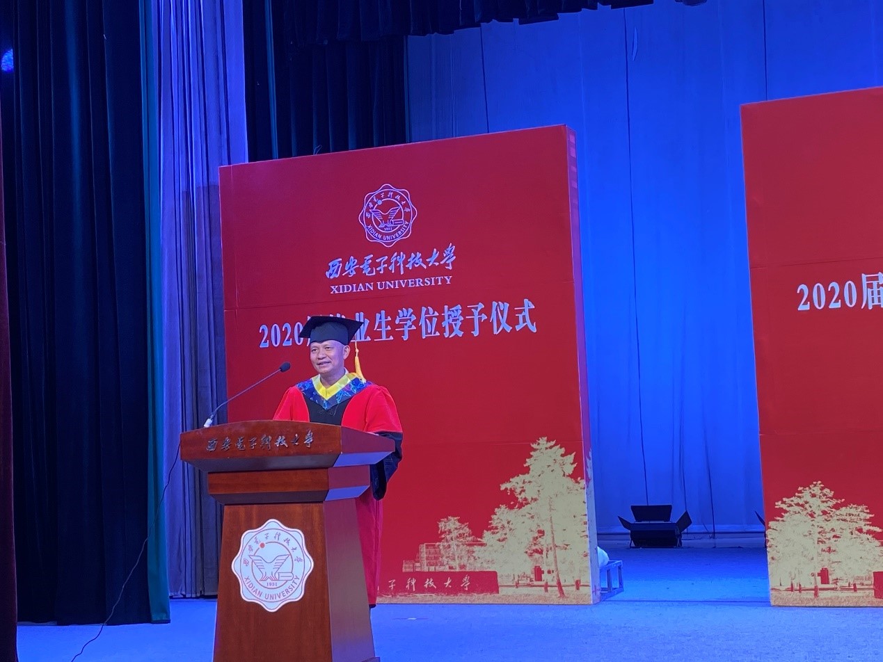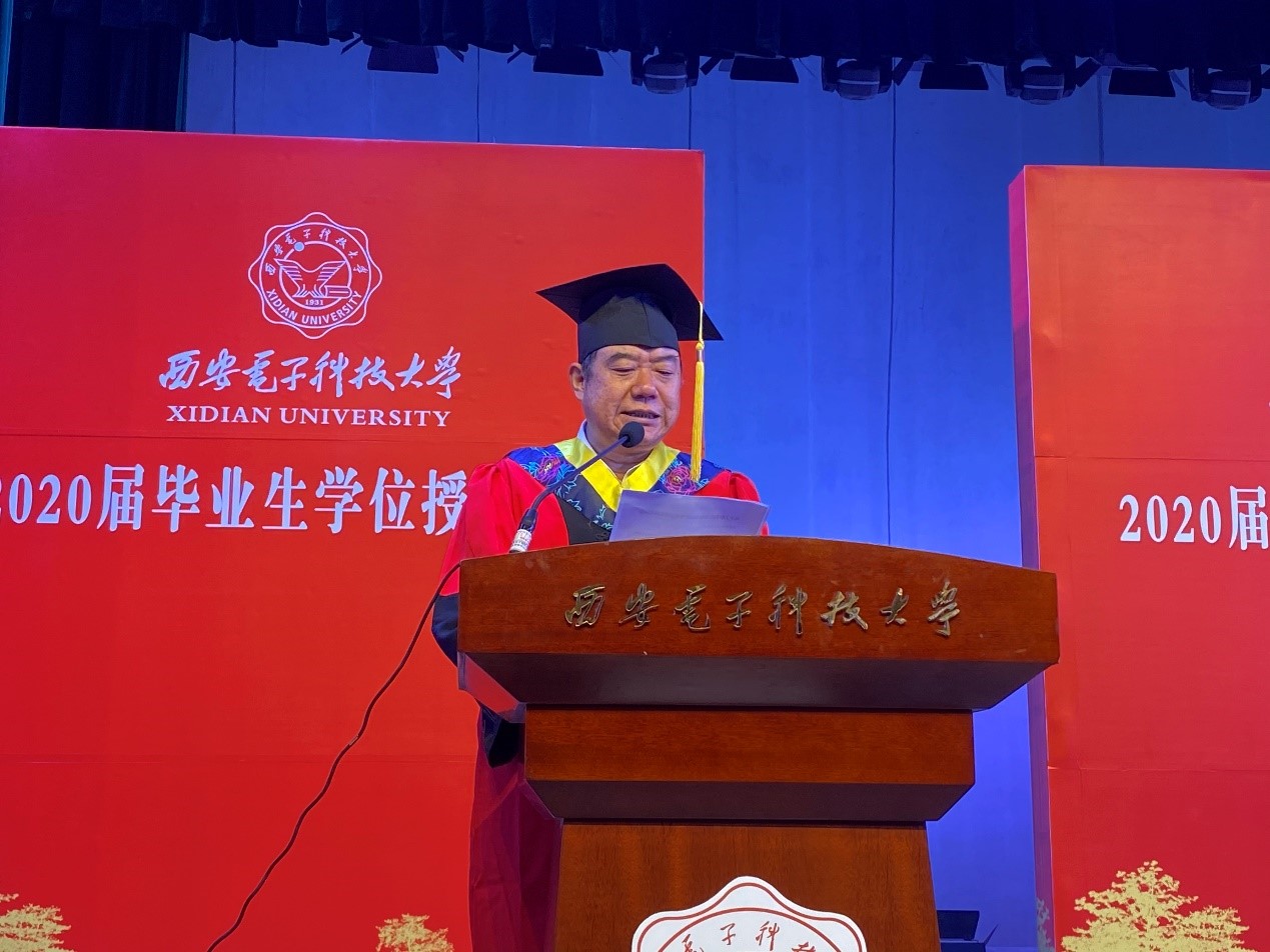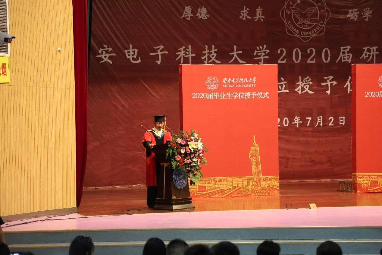 校党委副书记杨银堂向威尼斯9499登录入口2020届毕业生致以热烈的祝贺和真挚的祝福,并寄语同学们:“当前中国处于近代以来最好的发展时期,世界处于百年未有之大变局,变局带来变数,变局蕴藏机遇,技术、业态和模式创新不断涌现,人们的生活方式和思维模式变化显著,国家、学校和个人都面临着重新锻造竞争力的挑战。”他嘱托毕业生要坚守初心,继续秉承西电“厚德、求真、砺学、笃行”的校训,传承老一辈西电人的红色基因和家国情怀,面对充满变数的未来,保持定力,迎难而上、奋力实干、勇立潮头,不断成长为引领信息科技时代的领军骨干,为中华民族的伟大复兴而不懈奋斗。