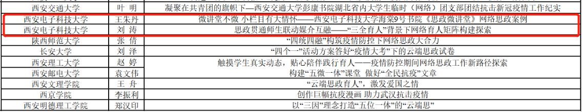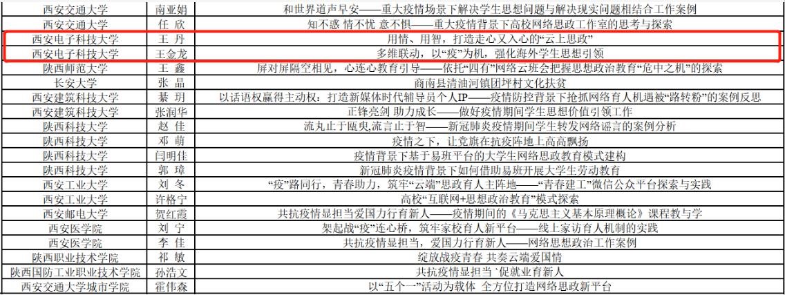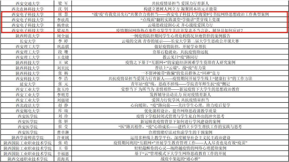 据悉,本次活动由陕西高校网络思想政治中心组织,以“共抗疫情显担当 爱国力行育新人”为主题,共收到省内41所高校的207件作品,最终决出一等奖5项、二等奖10项、三等奖20项、优秀奖30项,我校共有9名辅导员获奖。