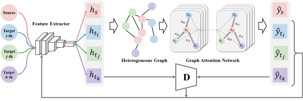 该工作着重解决深度网络在标签受限条件下的多目标域自适应问题,利用多域样本构造异构图以刻画样本之间的关联关系,并通过异构图注意力网络获得所有域的共同子空间。一方面,图神经网络的转导能力可以实现“源域到目标域”以及“目标域到目标域”之间的语义传播。另一方面,图神经网络的注意力机制能够在语义传播过程中进一步优化多域样本间的关联关系,提升转导效率。与单目标域自适应方法相比,该方法无需收集大量训练数据,且能有效利用目标域间的语义信息,显著提升了深度网络从单一源域到多个目标域的“跨域”识别能力。