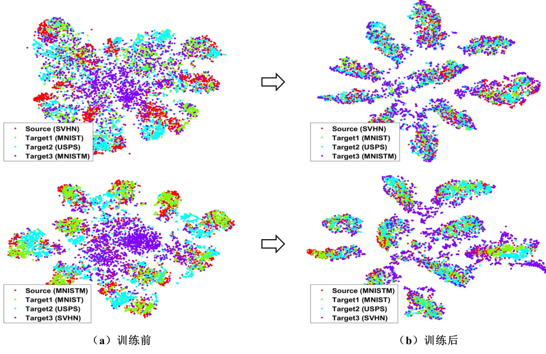 图2 多目标域自适应可视化结果(本方法可以同时优化多个无标签目标域的特征分布,提升了整体的跨域识别性能)
