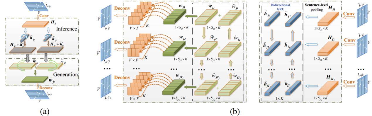 陈文超与王超杰发表的研究,基于团队在深度概率统计模型方面的系列工作,提出了一种新的层次化动态概率统计模型Bidirectional Convolutional Poisson Gamma Dynamical Systems(bi-CPGDS),针对one-hot编码的文本数据,不仅能够充分利用one-hot序列数据的稀疏性,并且将文本数据的word-sentence-document的层次化结构融入到模型中。使得模型不仅可以从文本中挖掘单词之间的时序性组成短语层次的结构化神经元,并且可以捕捉到这种结构化神经元在不同句子之间的转移关系。该模型结构相似于现有的卷积-动态层次化神经网络,包括了卷积层、概率池化层和循环网络层,但在解码部分,利用全概率生成模型对数据建模,从而赋予隐变量概率解释以及缓解网络对数据量的依赖性。模型的整体结构如下图所示。
