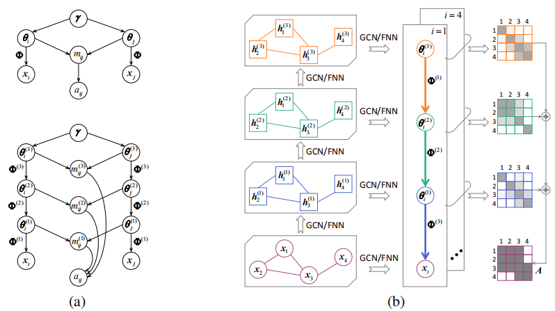 另一个工作则由王超杰和王东升合作完成,在图网络研究日趋火热的背景下,针对非欧式空间下的图网络数据提出了一种新型的深度概率图网络模型 Graph Poisson Gamma Belief Network,能够将非欧式空间下样本间的逻辑关系融入到样本的隐层表示中,从而得到表征能力更丰富的样本隐层表示。相比传统图模型只考虑单一层次的逻辑关系,该模型能够发掘样本之间位于不同语义层次下的逻辑关系,即对观测到的样本间的逻辑关系按照语义层次进行分解,并将层次化的逻辑关系融入到相应语义层次下的样本表示中。同时为了使模型更加实用做到实时预测,作者们引入了两种不同形式的图神经网络逼近样本隐层表示的后验分布,与上述深度概率图模型结合,进而提出了两种不同形式的深度概率图自编模型,并在图网络分析一系列任务中取得了不错的性能。模型的整体结构如下图所示。