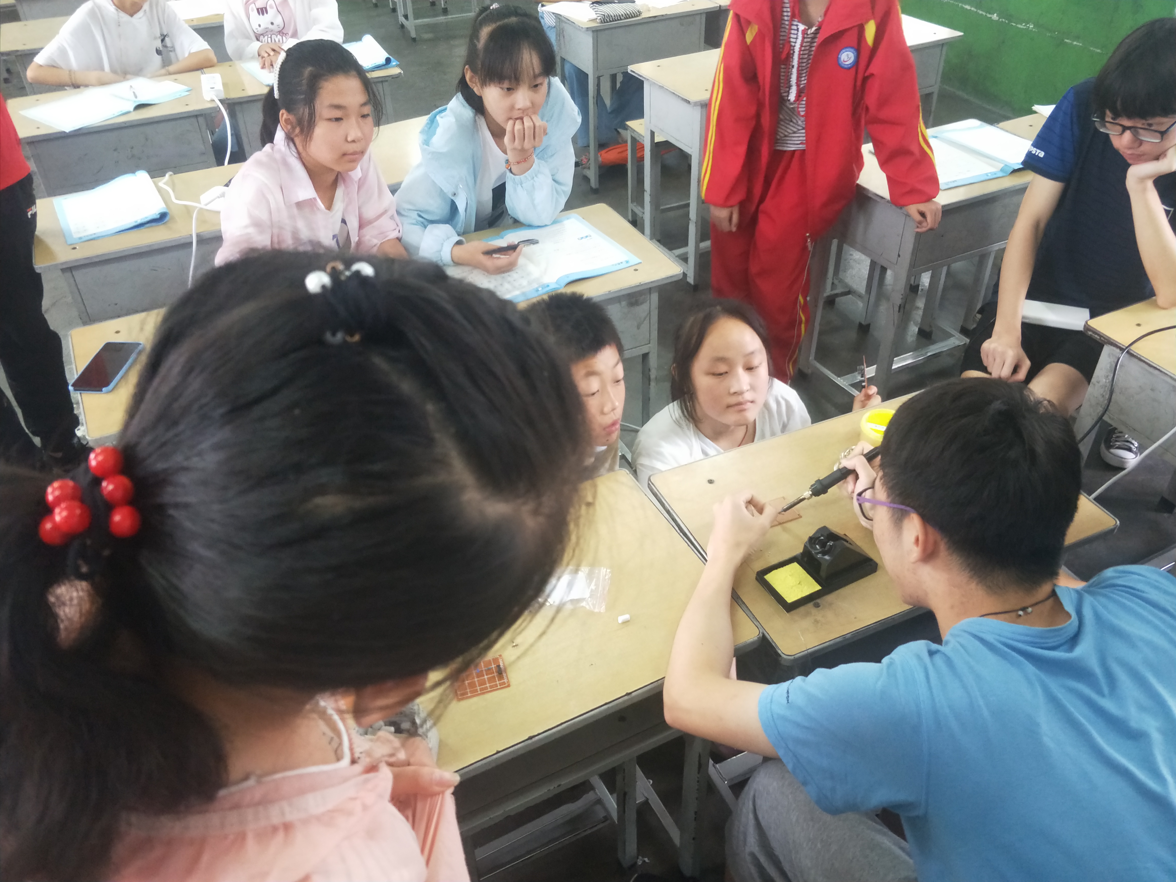 本次支教帮扶活动由电子信息知识科普和学生假期作业辅导组成,活动开始前学院制定了完善的教学知识大纲。7月14日,帮扶活动正式开始,支教帮扶“小老师”从一节电池开始,向翔村中学同学们讲述了电和电子元件在人们日常生活中发挥的重要作用,之后“小老师”向同学们展示了电阻、电容、二极管、洞洞板、焊枪、焊锡等元件。7月15日,“小老师”向同学们介绍了欧姆定律、电路构成等电路基础知识;7月16日,“小老师”为同学们讲解了电脑构成基本知识和编程设计的初步认识,向同学们介绍了散热器、CPU、显卡、硬盘、主板等,生动形象地解释了运算器、控制器、存储器、输入、输出设备五个构成部分。同时,“小老师”还为同学们介绍了二进制、十进制及相互转换基础知识。7月17日,“小老师”为同学们精心设计了动手实践环节。同学们通过动手焊接一个简易电路,充分体验到了学习电路知识的乐趣。7月18日,支教成员中“星火杯”参赛同学为翔村中学同学展示了一些简单的星火杯参赛作品--贪吃蛇、温控风扇、万年历等。7月19日,支教同学通过一些趣味视频,向翔村中学同学介绍了丰富的大学生活,鼓励他们刻苦学习,早日成才,以后在大学中不断提升自己,为祖国电子信息行业不断壮大贡献力量。