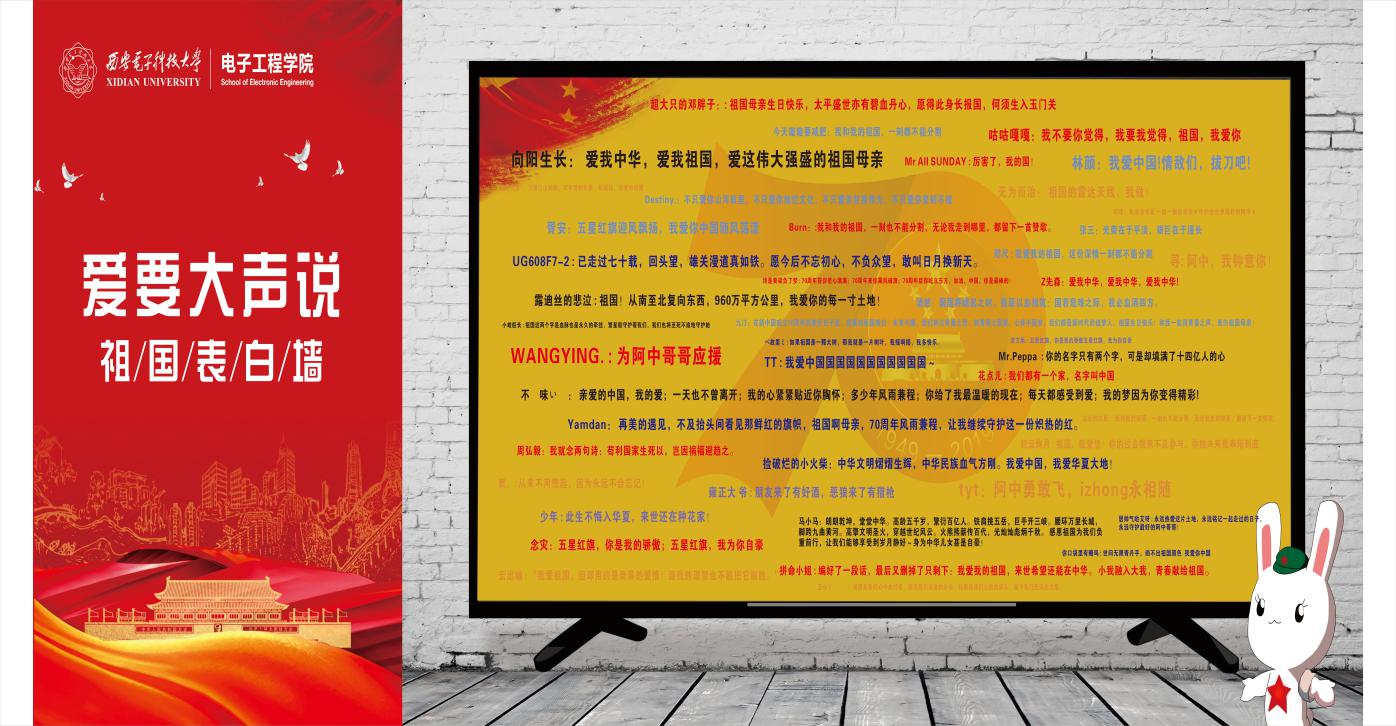 “为阿中哥哥应援”;“你的名字只有两个字,可是却填满了十四亿人的心”;“已走过七十载,回头望,雄关漫道真如铁;愿今后不忘初心,不负众望,敢叫日月换新天”...这是威尼斯9499登录入口举办“爱要大声说”祖国表白墙活动以来,收到威尼斯学子的真情告白,此次表白墙活动通过QQ空间在线展开,活动形式学生喜闻乐见,威尼斯各班级学生参加了此项活动,一句句表白言真意切,感人至深,充分抒发了和表达了深埋心底的爱国之情。学院历时一周搜集学生在线表白感言,认真整理并制作桁架在学校展出。