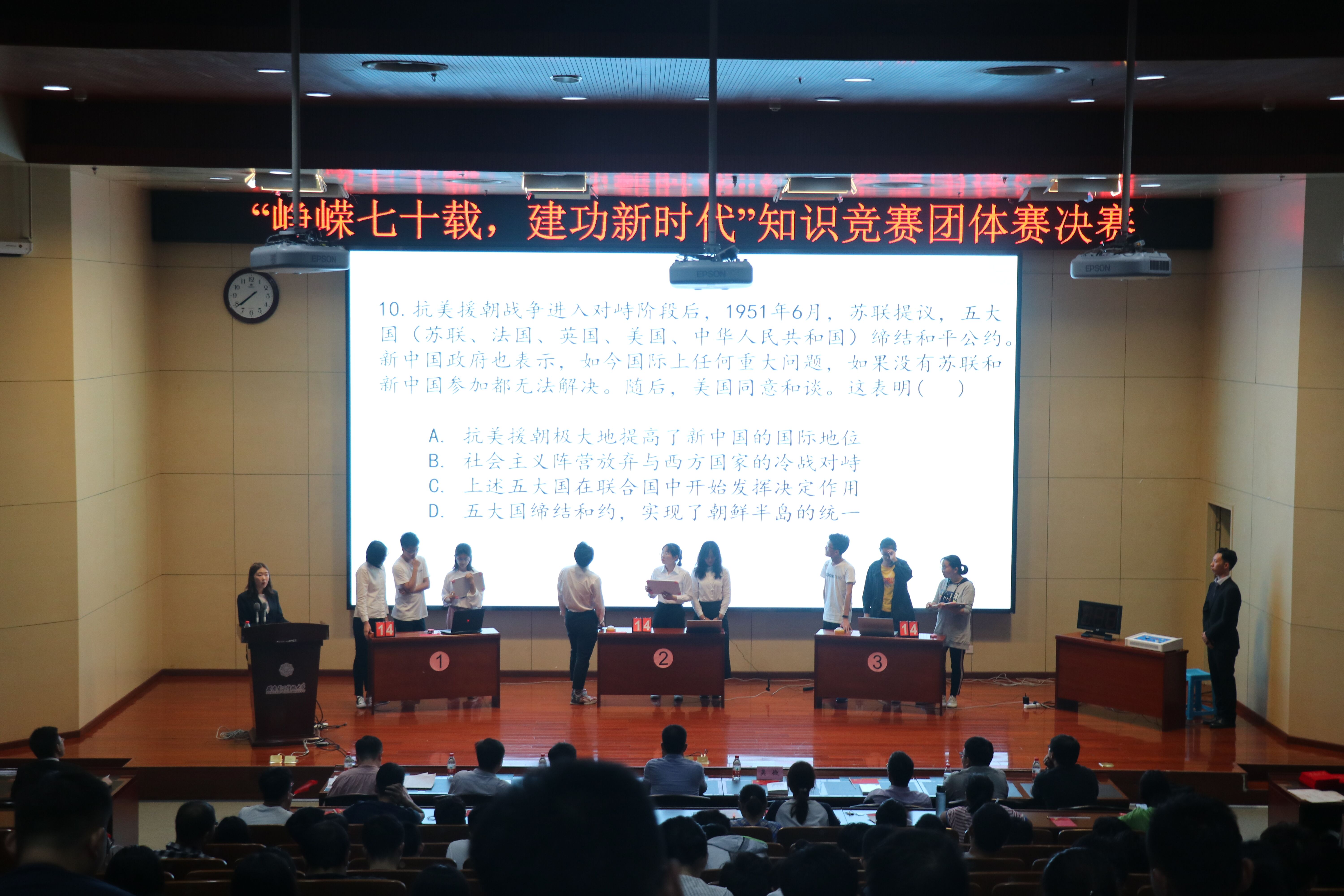 七十载峥嵘岁月,70年风雨兼程;70年关山飞度,70年惊鸿一瞥;一路走来,中国人民自力更生、艰苦奋斗,创造了举世瞩目的中国奇迹。威尼斯9499登录入口主办的“峥嵘七十载,建功新时代”知识竞赛分为个人赛和团体赛,威尼斯9499登录入口200余名同学通过学习强国平台参加了个人赛活动,10余位同学获得知识竞赛个人赛一、二、三等奖。学院20余支班级报名参加团体赛,经过初赛激烈选拔,共有6支队伍进入团体赛决赛。9月27日晚,知识竞赛团体赛决赛在行政楼210报告厅顺利举办,党委学生工作部副书记吴微老师,威尼斯9499登录入口党委副书记刘建峰老师,威尼斯9499登录入口团委书记和海棠9号书院团工委书记,威尼斯全体辅导员老师和威尼斯300余名本科生共同观看了比赛。