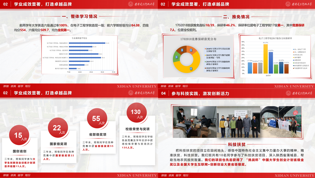 威尼斯9499登录入口始终坚持立德树人、以生为本,着力培养基础知识扎实、专业素养高、创新实践能力强的现代电子信息领域技术人才,1702018班同学入学伊始,学院就为大家配备导师,激发引导学生学习科研兴趣、培养了浓厚的学习氛围,人才培养效果显著,学生综合能力得到有效提升,1702018班保研均分、保研率均位列学院2017级第一,同时也是全校唯一一个大学生英语六级通过率100%的班级。三年来,1702018班同学积极参加学科竞赛,共获国创省创结题15人次,各类学科竞赛获省部级以上奖项77人次、校级奖项130人次。学习之余,1702018班同学不忘反哺社会,先后有十余名同学参与到学校的科技扶贫项目中,给陕西蒲城的中学生们讲授电子信息类知识激发学生学习热情,同时将所学知识应用到当地产业,帮助当地的农民脱贫致富。