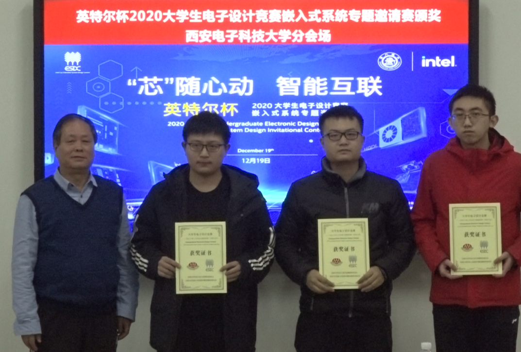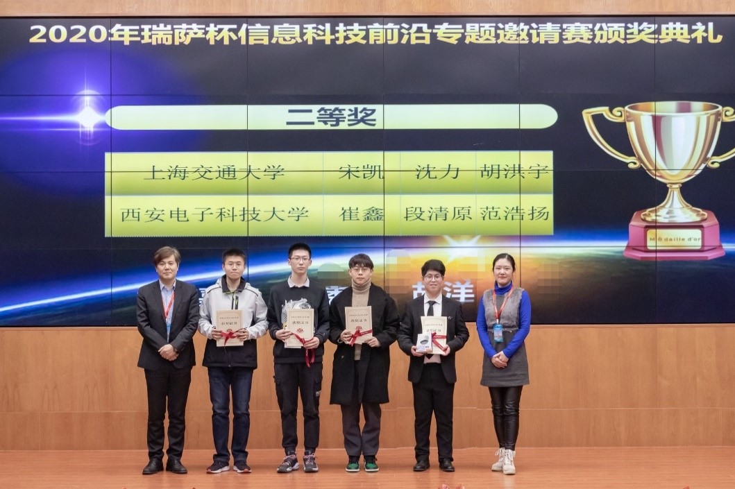 颁奖嘉宾为西电获奖学生(右二)颁奖(瑞萨前沿信息邀请赛)