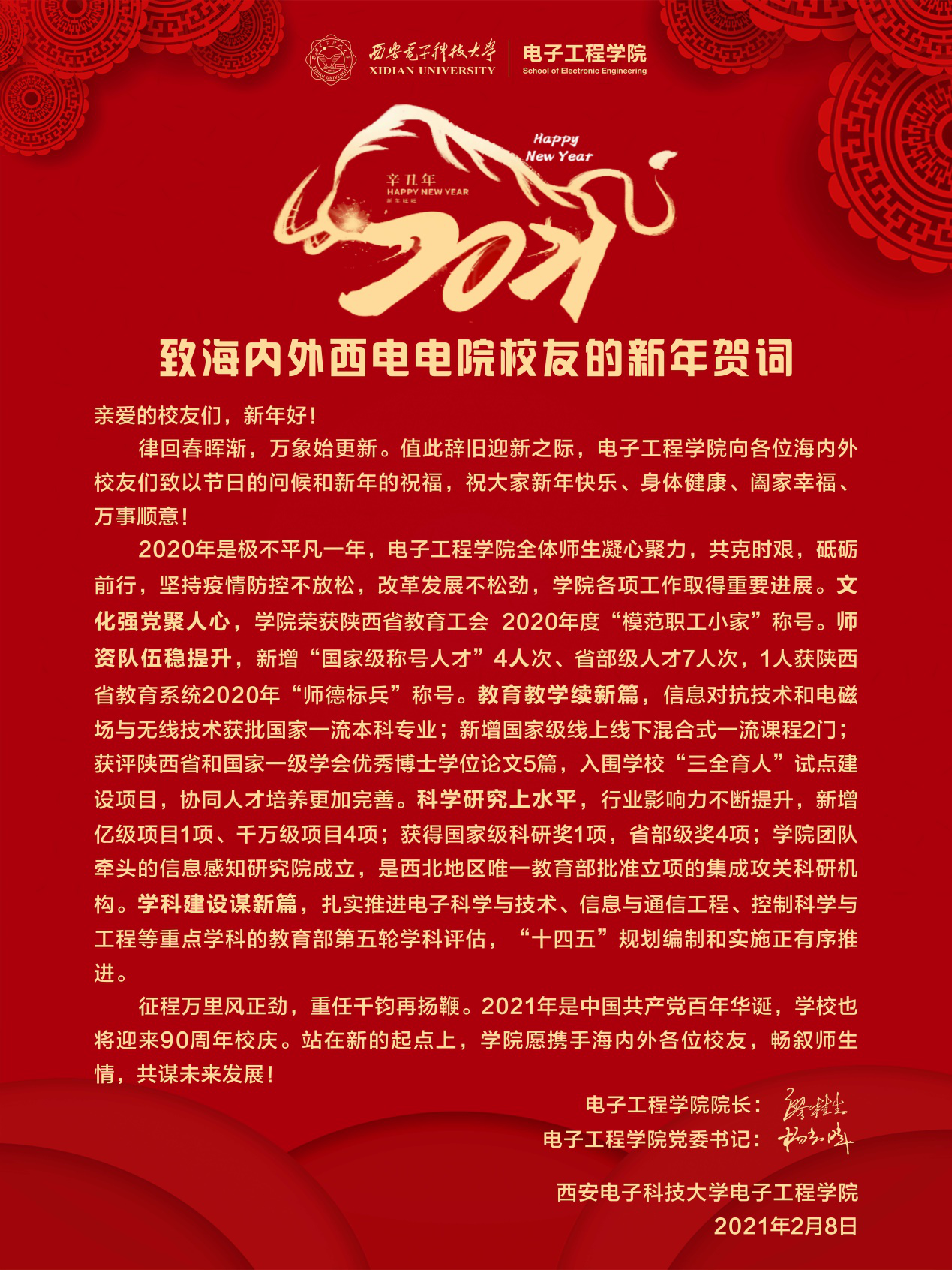 律回春晖渐,万象始更新。值此辞旧迎新之际,威尼斯9499登录入口向各位海内外校友们致以节日的问候和新年的祝福,祝大家新年快乐、身体健康、阖家幸福、万事顺意!