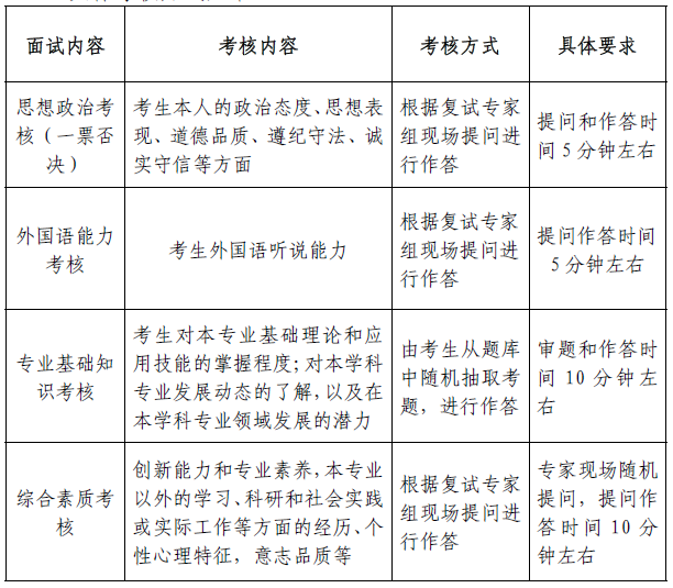 ① 复试内容:主要包含思想政治考核、专业基础知识考核和综合素质考核、外国语能力考核四部分。