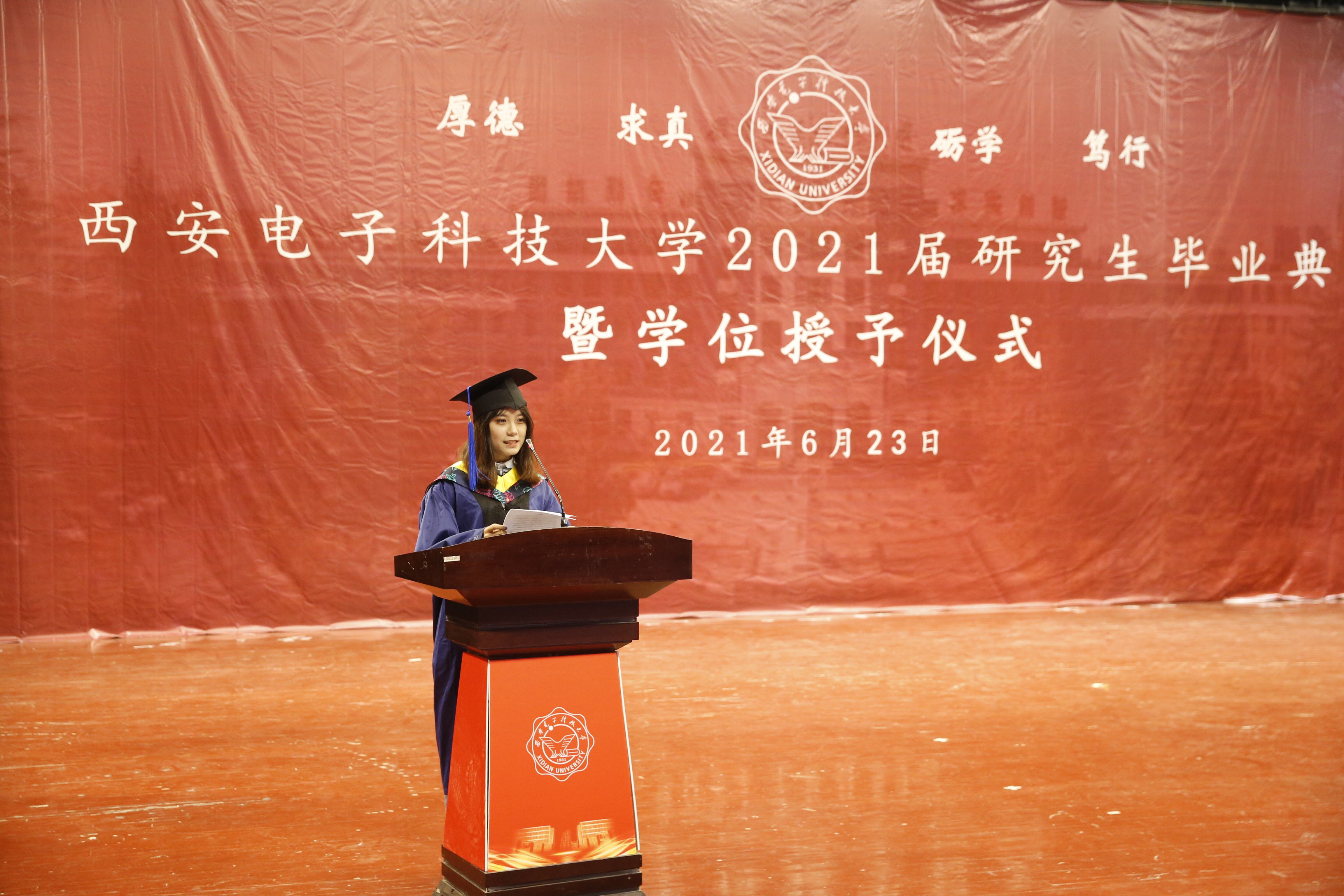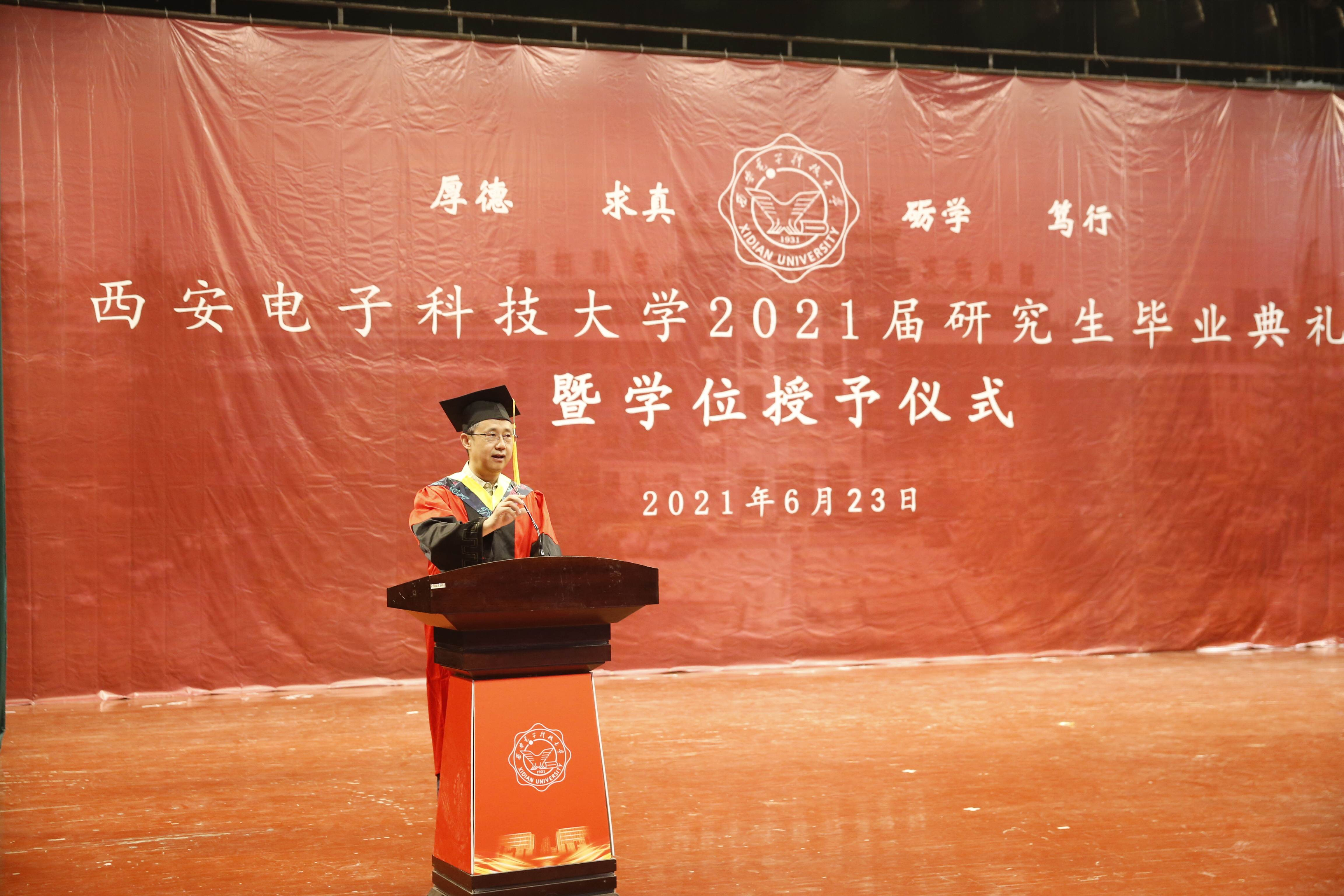 典礼在雄壮的国歌中开始。随后,崔铁军院士向毕业生寄语殷切希望,他勉励同学们要坚守爱国情怀,回报家国,服务社会;要勇担时代使命,续写好“西电现象”,做合格的社会主义建设者和接班人;要丰富人生智慧,以包容的心态不断吸收新知识,强大自己。