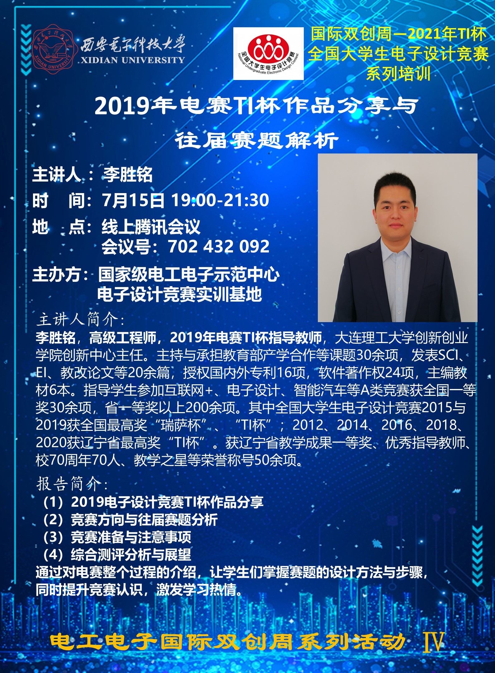 李胜铭,高级工程师,2019年电赛TI杯指导老师,大连理工大学创新创业学院创新中心主任。主持与承担教育部产学合作等课题30余项,发表SCI、EI、教改论文等20余篇,授权国内外专利16项,软件著作权24项,主编教材6本。指导学生参加互联网+、电子设计、智能汽车等A类竞赛获全国一等奖30余项,省一等奖以上200余项。其中全国大学生电子设计竞赛2015与2019获全国最高奖“瑞萨杯”、“TI杯”;2012、2014、2016、2018、2020获辽宁省最高奖“TI杯”。获辽宁省教学成果一等奖、优秀指导教师、校70周年70人、教学之星等荣誉称号50余项。