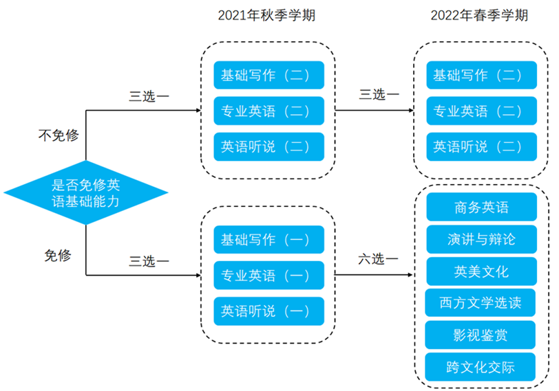 已成功申请了英语能力等级认定的博士研究生,博士英语课程《学术交流英语》(X0FL0014)免修免考,直接获得学分;不满足英语能力等级认定条件或者未申请英语能力等级认定的同学,直接制定培养计划,学习博士《学术交流英语》课程,通过考试获得学分。