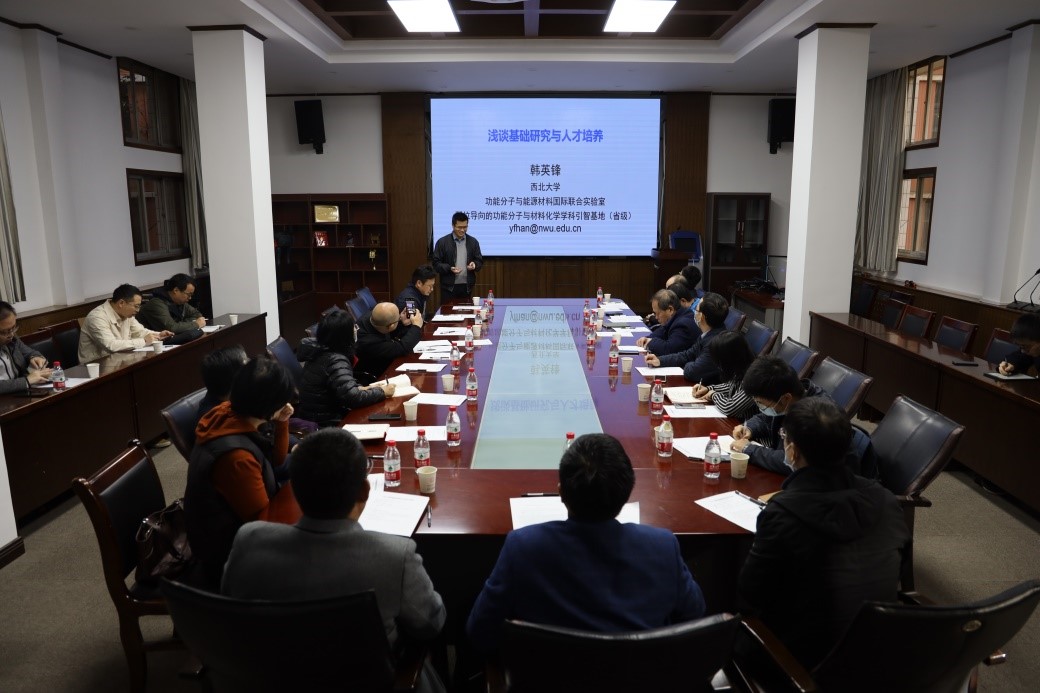 (通讯员 刘昕雨)10月22日上午,学院党委理论学习中心组(扩大)会议在北校区办公楼第三会议室召开,专题学习基础科学研究相关政策和评价解读,邀请西北大学化学与材料科学学院国家杰出青年基金获得者韩英锋教授做关于基础研究的主题报告。学院班子成员、两委委员、教职工党支部书记、系所主任和青年教师参加学习,会议由丁金闪主持。