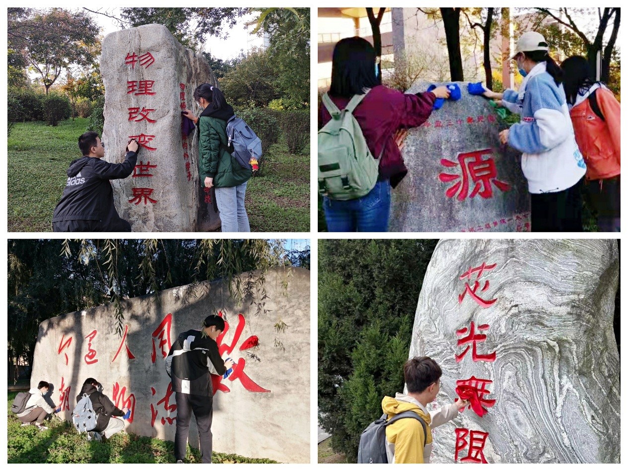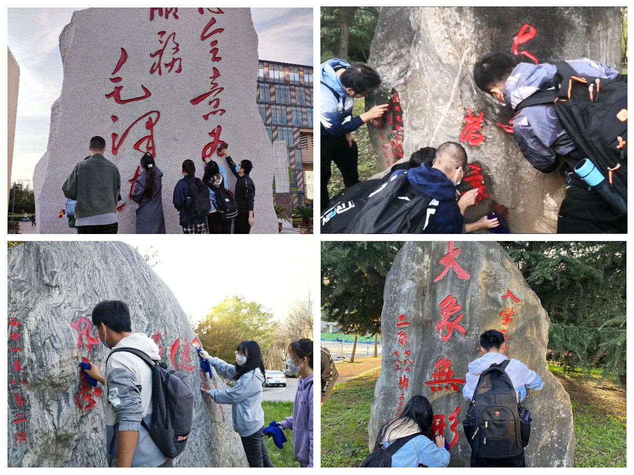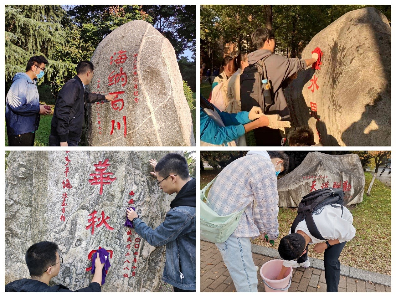 参观结束后,同学们分组对校园内12块校友捐赠石刻进行全面细致的清洁工作。一块块校友捐赠石刻,是校友们不忘母校、感恩母校的见证,更是校友们对母校的真挚祝福、对学弟学妹的殷切期望。同学们将一块块校友捐赠石刻擦洗干净,既为校友们守护这份记忆,又在劳动的过程中增强归属感、荣誉感、使命感。
