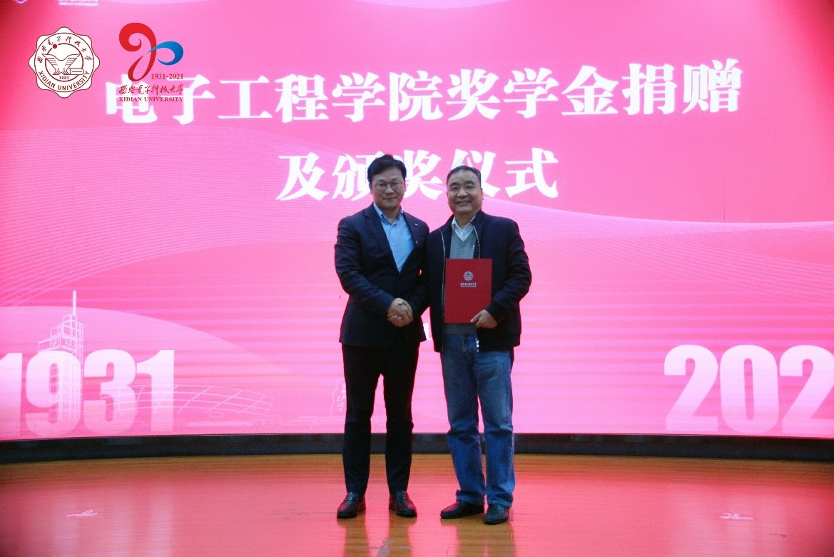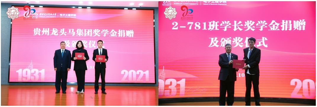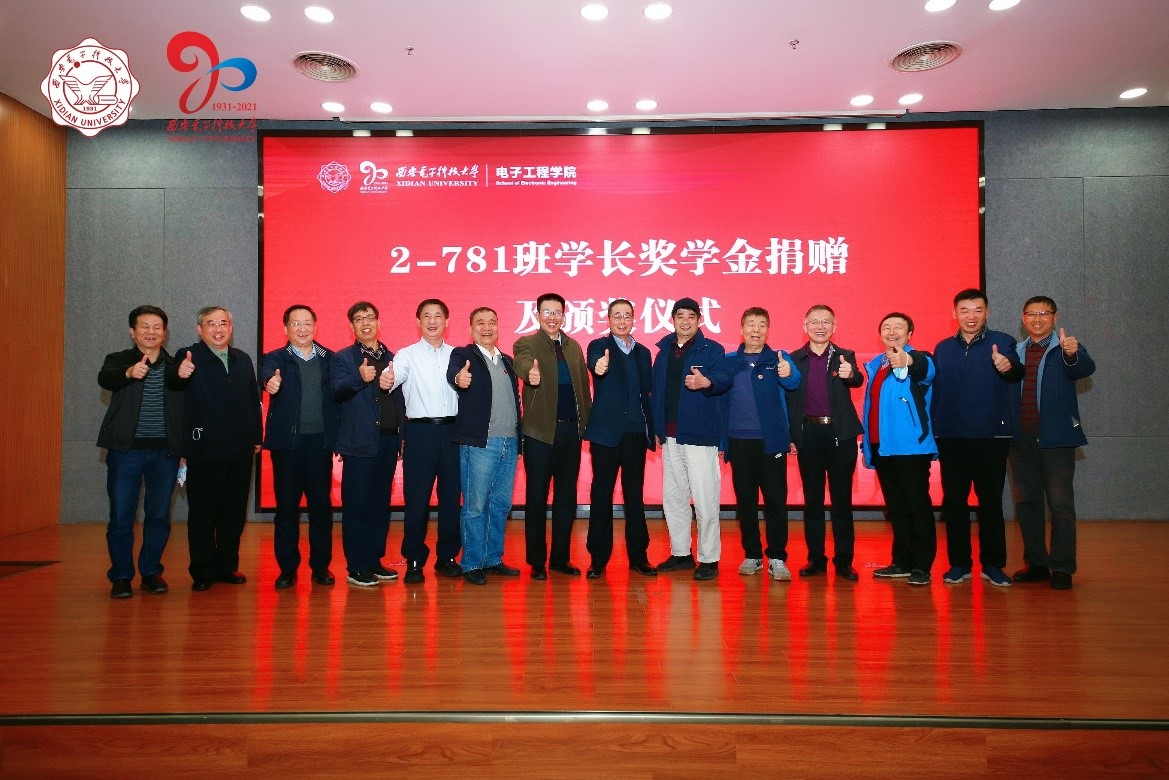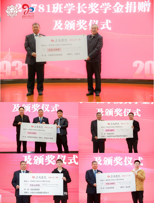 捐赠仪式分别由2-781班校友代表、贵州龙头马集团代表、何文伟校友、江苏肯立科技股份有限公司代表、上海霍莱沃电子系统技术股份有限公司代表上台向学校赠送支票牌,由杨银堂为企业代表和个人颁发证书。