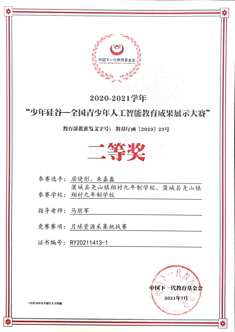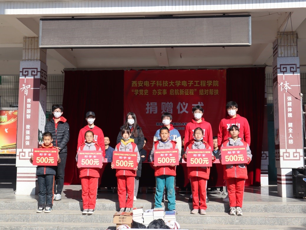 2017年起,学院对接蒲城尧山镇翔村九年制学校开展“一院一品”特色帮扶,充分发挥学院在乡村振兴中的社会服务功能。学院结合学科特色和优势,一是捐赠文具、书籍、体育活动用品、乐器等物资,支持翔村九年制学校坚持“五育”并举,全面发展中小学生素质教育。2021年,学院捐赠4万元用于支持翔村九年制学校购买乐器和科教器材等,学院本科2019级8名本科生捐赠4000元书籍和体育用品。二是开展“学党史、办实事,启航新征程”捐赠活动,8名本科生将自己获得的奖学金1.1万元捐赠给翔村学校家庭贫困、品学兼优的学生,将自身社会责任感和历史使命感传递给学生,鼓励学生刻苦钻研,用科学知识报效祖国。三是开展翔村学校师生代表走进西电,参观校史馆、博物馆等,感受“爱党爱国、勤勉务实,信息特色、敢为人先”的西电品质和大学文化,开拓眼界,提升学习兴趣。四是落实“科创+”助力教育振兴计划,2021年学院资助建成的科创小屋已投入使用,用于翔村九年制学校开设3-6年级学生的科学课程、开展“科创+”暑期夏令营和青少年人工智能竞赛培训,暑假期间学院帮助送出一支队伍参赛,获得“全国青少年人工智能教育成果展示大赛”二等奖,2021年11月学院资助参加“筑梦杯”第三届科创小屋实力赛,获得一等奖3项,三等奖3项。