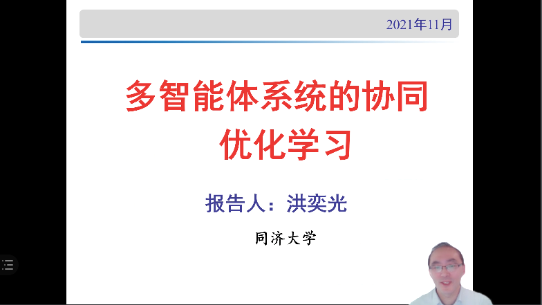 洪奕光教授主要从理论方面讲解多智能体系统。指出多智能体系统具有系统效应,即简单的局部规则通过协同导致复杂整体行为,具有复杂结构和复杂动态。报告从分布式优化和分布式非合作博弈两方面介绍分布式决策,并介绍凸交计算、资源分配优化和博弈以及在线优化三个方面的成果。分布式凸交计算其目标是找一组凸集交集中的一个点,在非空的交集内实现同步,其优点是具有隐私性。洪教授团队提出投影趋同算法(PCA),分别在一致联合联通和双向图情况下实现凸交。后将该算法一方面推广到近似投影(APCA),取得更良好的结果,验证了该结论的充分必要性,并找到了临界近似角。另一方面推广到空心集交集计算,从凸交计算转换到环交计算。再者推广到求解线性方程,每个个体只有局部信息,通过凸交计算合作求解整个方程。分布式资源分配问题洪教授生动简易地利用分蛋糕来讲解如何实现整体最优化,还通过仿真验证有效性,也拓展了从无向图到有向平衡图、从等式约束到不等式约束、从确定性到随机优化或鲁棒优化以及博弈等多种推广。最后介绍在随即图上的分布式在线优化学习,其研究对象是时变的或者数据是实时的,并介绍现有在线凸优化算法文献以及团队给出的全信息反馈算法以及单点Bandit反馈。洪教授总结道,多智能体系统协同分析与设计至关重要,是众多重要问题的基础,其研究挑战涉及多学科交叉,如运筹学、控制论、网络科学、计算复杂性和机器学习等,应用非常广泛如在线估计(传感器网络)、资源分配(无线通讯、智能电网)、交通运输(社会网络)、规划决策等。