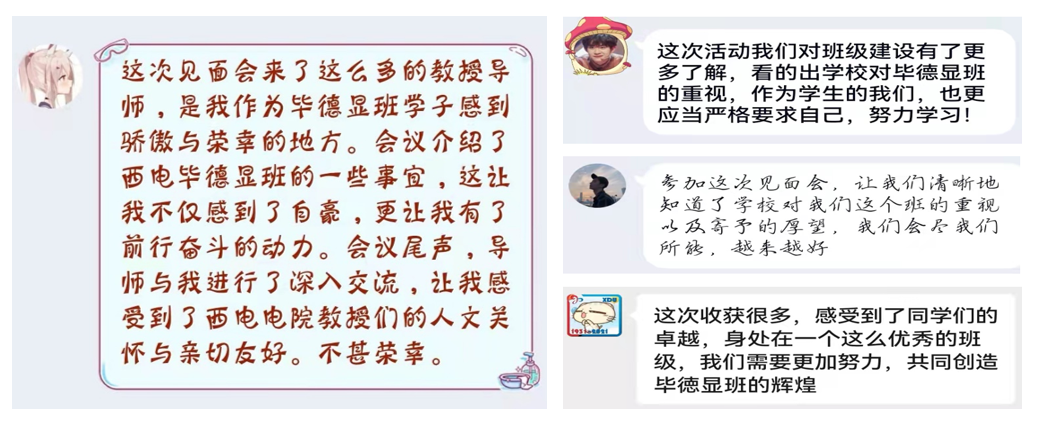 最后,“毕德显班”新生与学业导师进行自由交流,导师们在生活、学习、规划、发展等多方面耐心地为同学们答疑解惑。“毕德显班”新生纷纷表示对未来四年本科学习充满了热情,将会积极了解大学生创新创业、互联网+、数学建模等大赛政策与参赛注意事项,部分同学提出希望能有机会参观雷达信号处理国家级重点实验室,对此,导师们表示热烈欢迎。