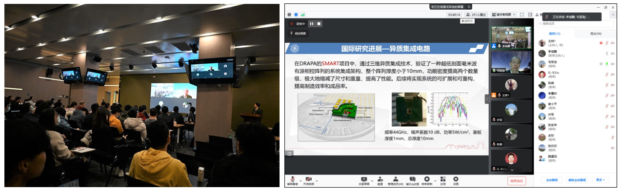 仪式结束后,会议特邀四位著名学者为与会师生做了精彩的学术报告(线上),分别是上海交通大学毛军发院士的《半导体异质集成技术》、东南大学王志功教授的《射频通信、光通信与神经通信集成电路设计与应用》、清华大学许军教授的《超陡亚阈斜率MOS晶体管的研究简介》、北京大学李廉林教授的《智能电磁感知新进展》。线上听众流量达到日会峰值,现场交流活跃,掌声不断,专家们独特的学术视角和渊博的学术知识给参会人员留下极其深刻的印象,让聆听报告的师生受益匪浅。