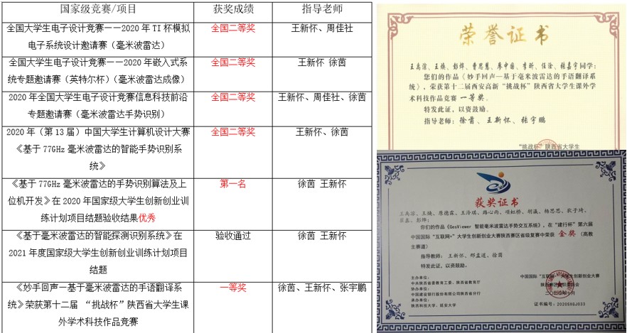 依托该项目及课程,运用毫米波雷达平台及课程学习的知识,参加了大学生全国电子设计竞赛、互联网+创新创业竞赛等全国性竞赛及项目,并指导学生获得了优异的竞赛成绩,其中包括全国电赛TI模拟专题赛国二2项,全国电赛嵌入式专题赛国二1项,全国电赛瑞萨前沿信息专题赛国二1项,中国互联网+创新创业竞赛省级金奖1项,中国计算机设计竞赛国二1项,国创结题优秀第一1项,国创项目4项,其他项目6项。多名学生受益于该课程提升能力,保送清华大学等高校。